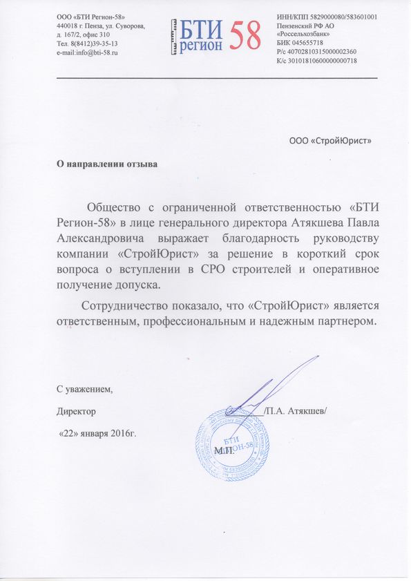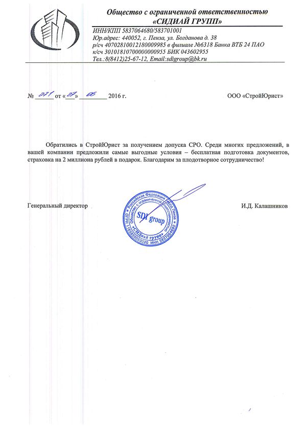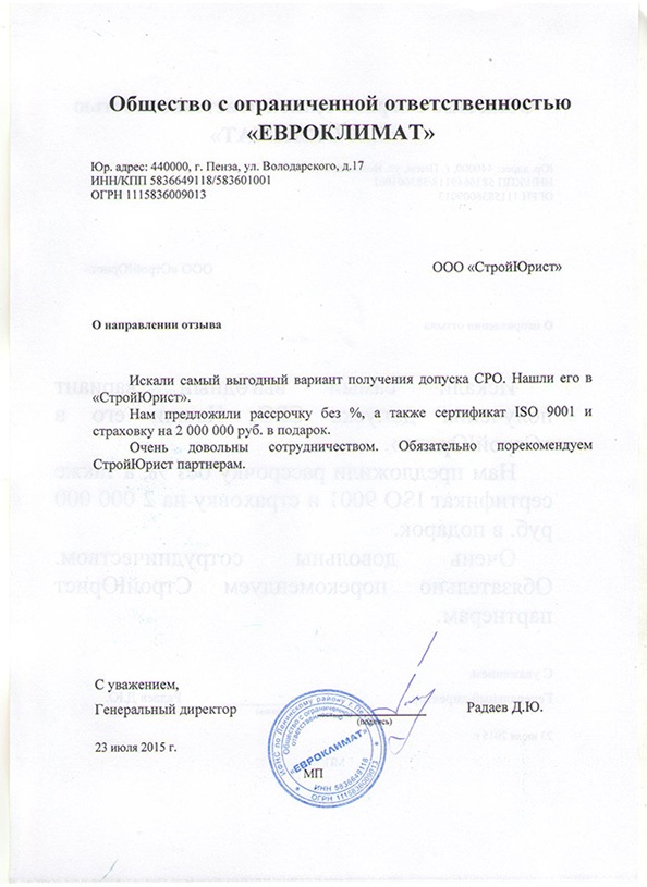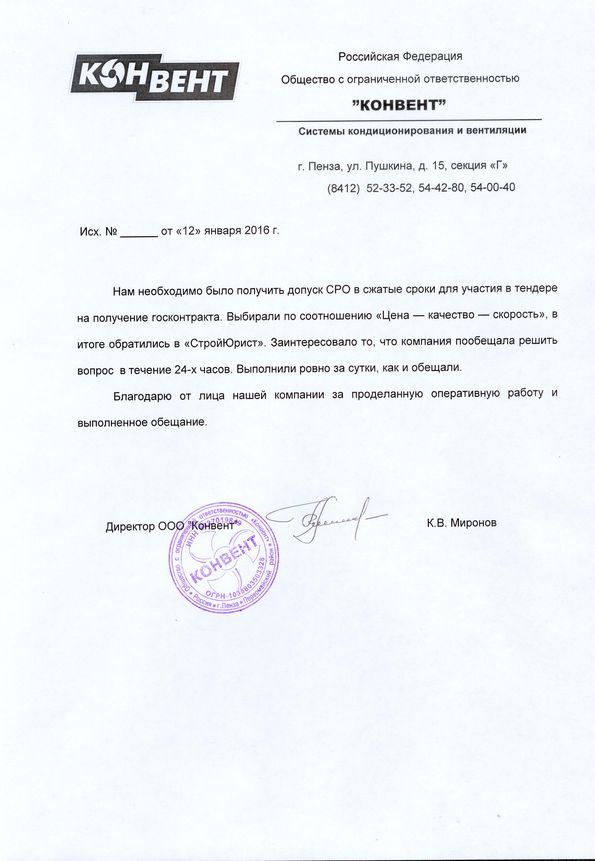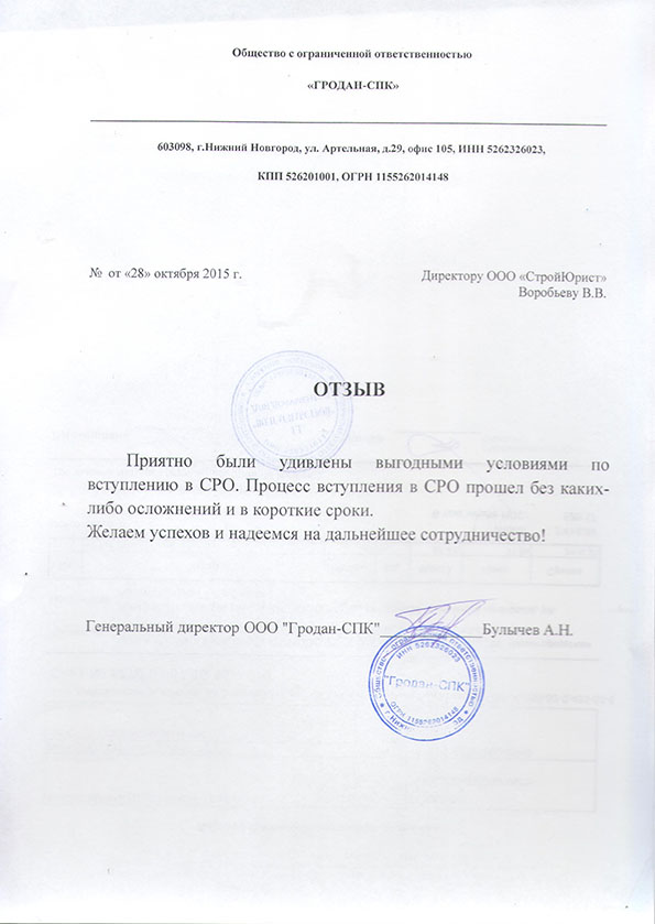 Отзывы клиентов "СтройЮрист" по вступлению в СРО в Кисловодске